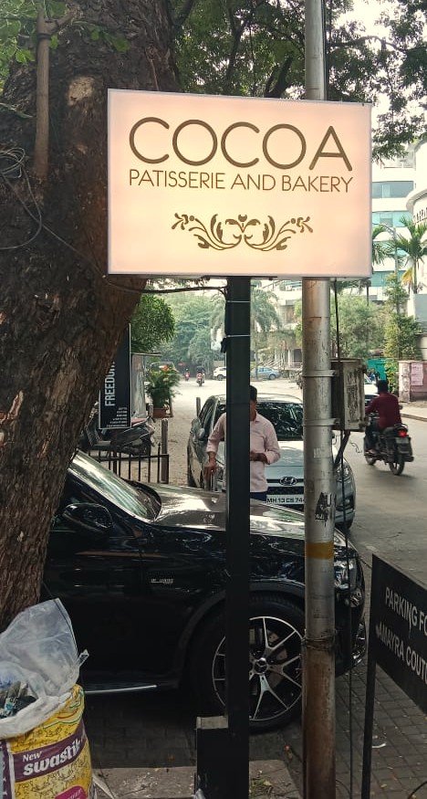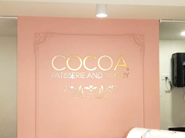 Cocoa Patisserie And Bakery Shop sign board made out of 3d golden SS letters mounted on a white acp base sheet