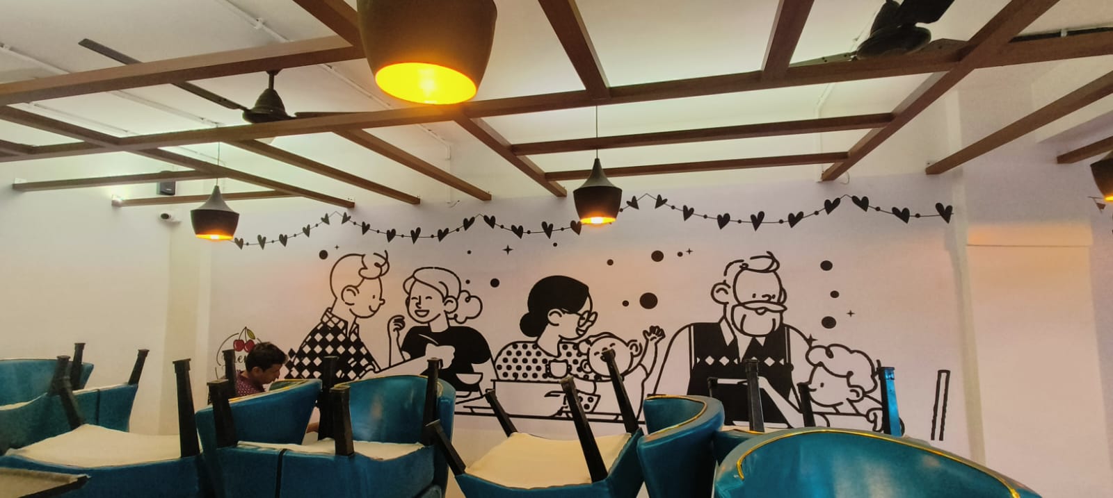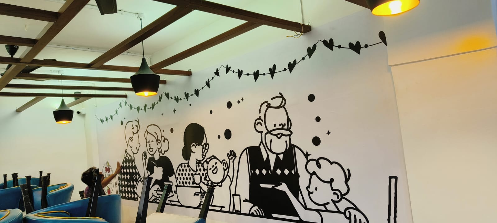 So, we simply reproduced her artwork at an extremely high resolution on specialised wall vinyl media. Then, we carefully plastered these masterpieces onto the cafe walls, transforming the space into a gallery of giggles and grins.