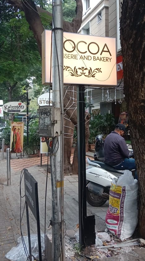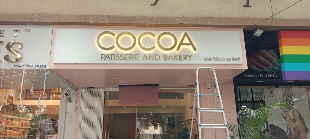 In this next example, we branded the interiors of the Cocoa Patisserie Bakery in Koregaon Park, Pune. We installed an acrylic cutout of the company logo right behind the serving counter, where it grabbed the attention of every client who walked in.