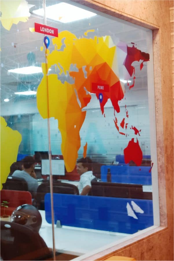Branding on glass is not a very expensive affair. You can keep changing the look of your glass partitions even on a modest budget. And more importantly, the adhesive / glue of glass films that we supply do not damage the surface of the glass that they are pasted upon. So, you can change the print if it does not meet with your specifications or if you get too bored looking at it.