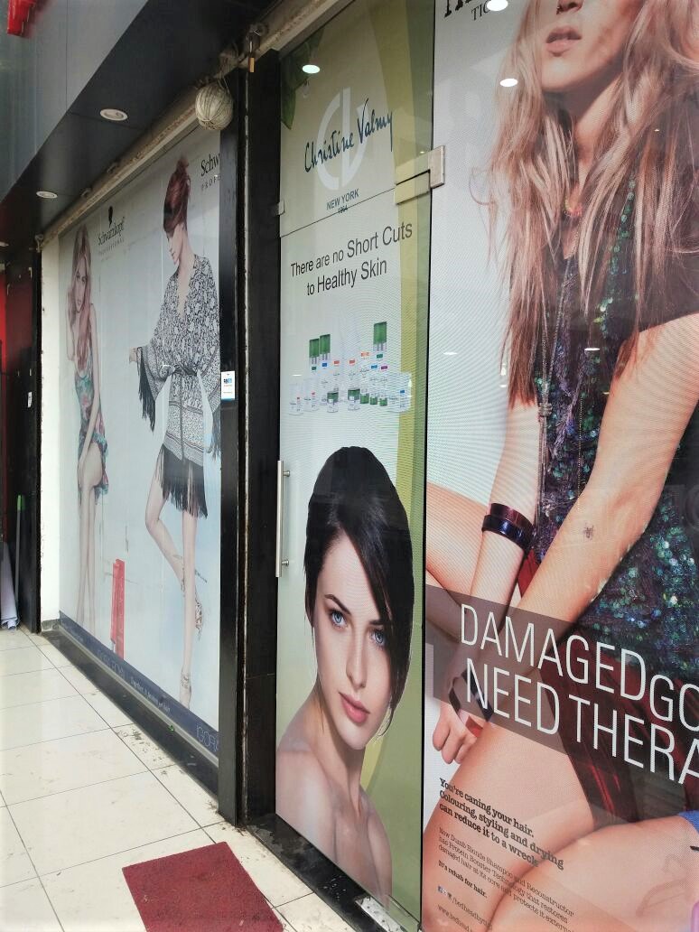 | One way vision mesh film for glass facades | This is a high resolution photo print on a special film pasted on the glass frontage of the store. This film shows the company branding to a passersby on the road while at the same time allowing people inside the store to look outside. | ₹ 90/- per square foot | Royal Canin glass frontage of clinic |