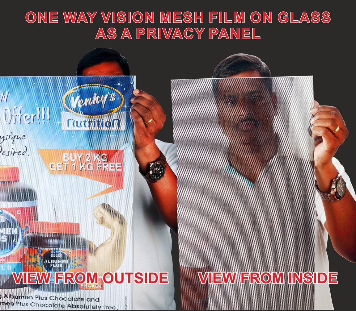 One-way dotted film for glass also aids privacy, wherein the customer standing outside looks at the branding on the glass and the person on the inside (non image side) can look through the glass. Hence the name ‘One way vision film for glass’. Needless to say, this film opens up immense opportunities for branding and advertisement.