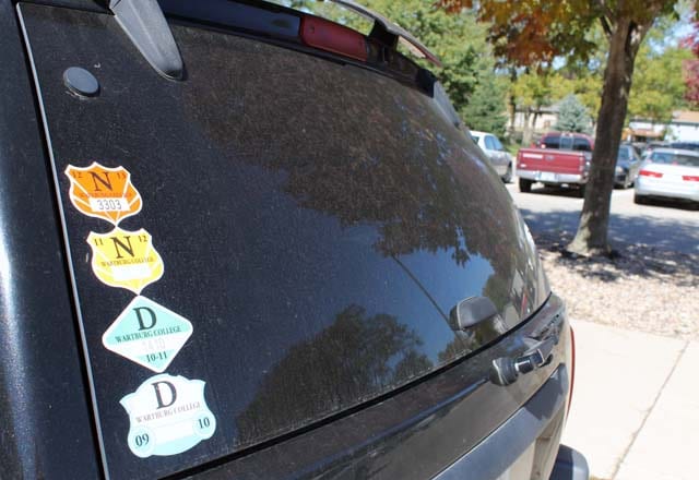 Our parking stickers are pretty simple to use. Just peel off the adhesive film (front or back, depending on which vehicle you’re applying it to) and stick it onto the surface. Apply just a little bit of pressure to even out the sticker, and voila – it’s all set!