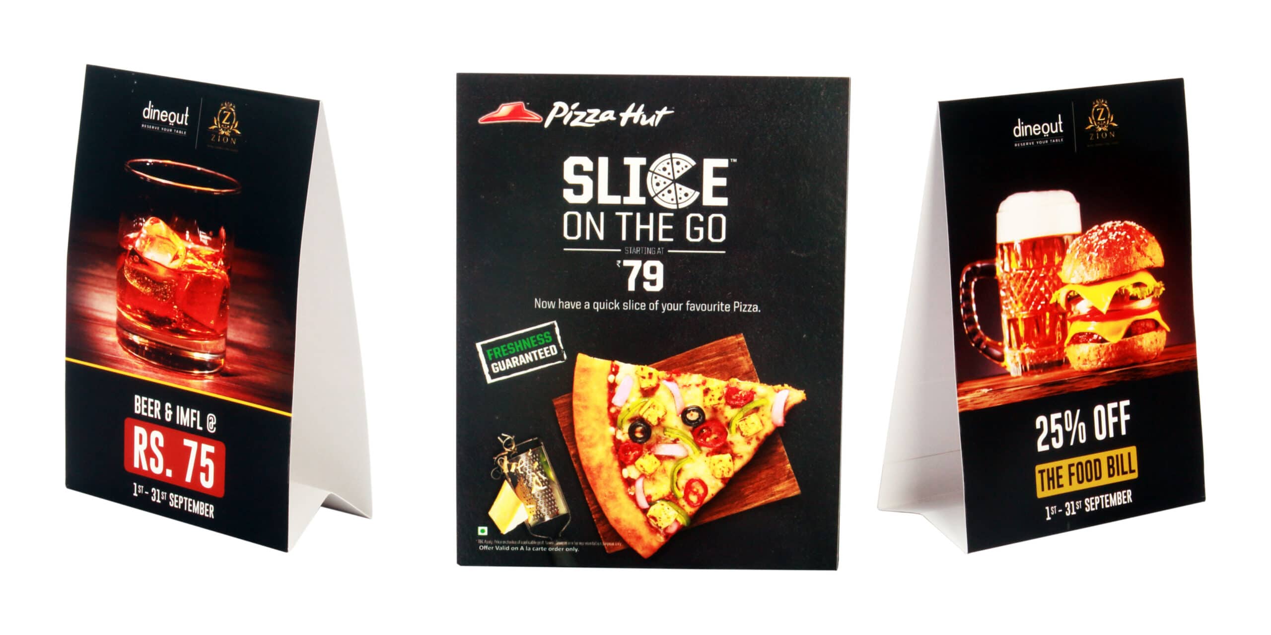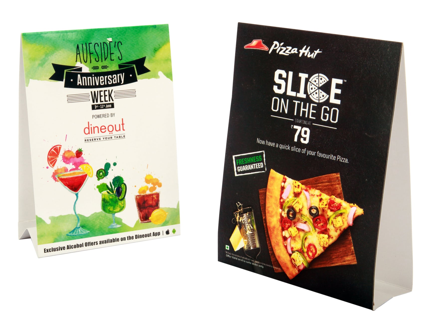 Tent cards, as the name suggests are prints shaped like tents, strategically placed on tables, desks, counters, etc. to catch the customer’s eye. These low-cost cards have a one-point agenda – to grab customer attention.