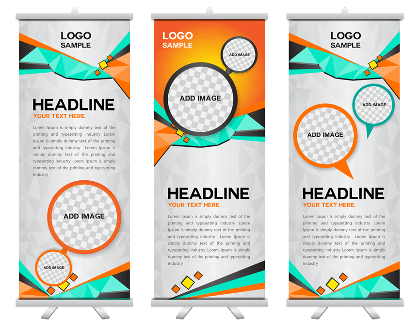 3 pull up standee printing design templates which can be adapted for use in Hotels Training camps Exhibitions Supermarket aisles retail stores Entrances of commercial places etc